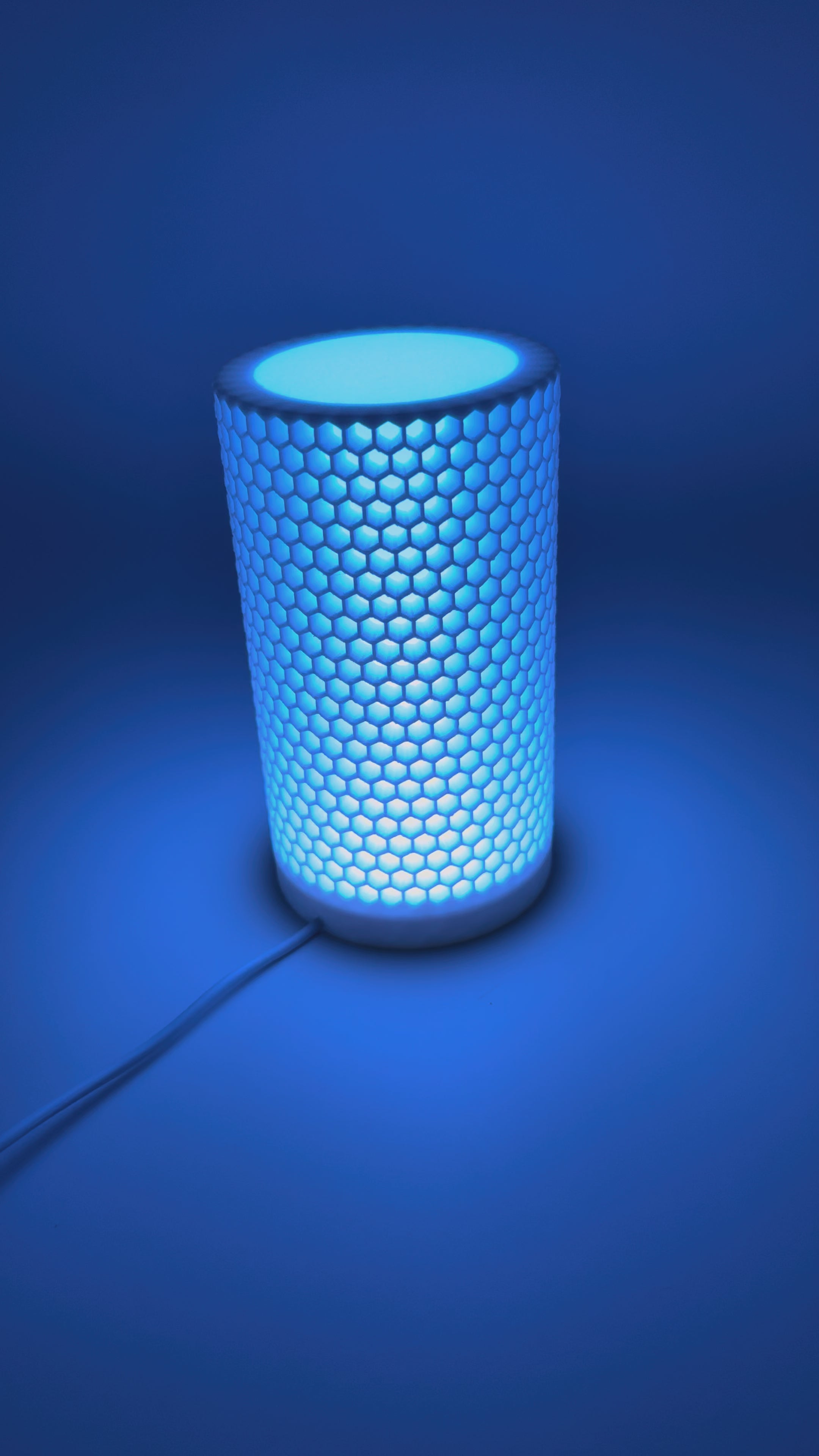 Deze stijlvolle tafellamp heeft een cilindervormige kap met honingraatpatroon, wat zorgt voor een speels lichteffect zodra de lamp wordt ingeschakeld. Het warme licht schijnt subtiel door de openingen en creëert direct een gezellige en uitnodigende sfeer in elke ruimte.